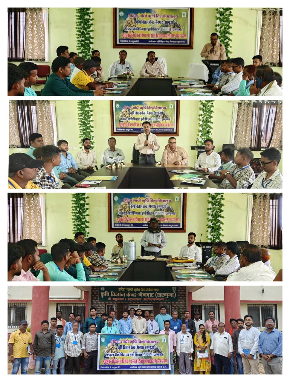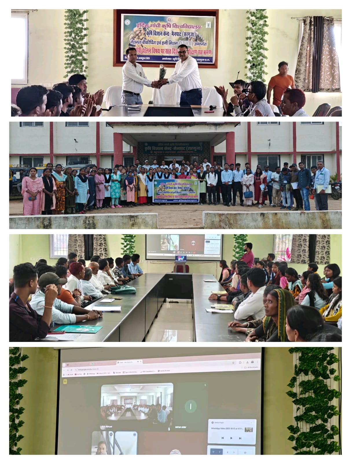 मुख्य अतिथि माननीय सीतापुर विधायक श्री रामकुमार टोप्पो जी के द्वारा सात दिवसीय मधुमक्खी पालन प्रशिक्षण कार्यक्रम का समापन इंदिरा गाँधी क़ृषि विश्वविद्यालया के अंतर्गत संचालित क़ृषि विज्ञानं केंद्र, मैनपाट मे नेशनल हनी बोर्ड एवं हनी मिशन अंतर्गत सात दिवसीय मधुमक्खी पालन विषय पर प्रशिक्षण का समापन मुख्य अतिथि माननीय सीतापुर विधायक श्री रामकुमार टोप्पो जी के द्वारा आज दिनांक 15/10/25 को ऑनलाइन माध्यम से जुड़ कर किया गया! माननीय विधायक महोदय द्वारा सात दिवसीय प्रशिक्षण कार्यक्रम के प्रशिक्षु कृषक बंधुओं को सीतापुर अंचल में मधुमक्खी पालन कर शुद्ध शहद उत्पादन कर खुद के आर्थिक स्थिति को सदृढ़ करने के लिए प्रोत्साहित किया गया तथा साथ ही साथ कृषि विज्ञान केंद्र, मैनपाट की भी सराहना की गई। क़ृषि विज्ञानं केंद्र के संस्था प्रमुख डॉ राजेश चौकसे ने स्वागत उदबोधन मे बताया की क़ृषि की फसलो की 60-70 प्रतिशन फसलों का पॉलिनेशन मधुमक्खी के माध्यम से होता है सरगुजा जिले में मधुमक्खी पालन की अपार संभावनाएं हैं इसी को ध्यान में रखते हुए क्षेत्र के इच्छुक 25 प्रशिक्षण करने वाले को आवासीय प्रशिक्षण दिया गया l प्रशिक्षण में एक दिन प्रशिक्षार्थियों का भ्रमण कराया गया और थ्योरी के साथ-साथ प्रायोगिक प्रशिक्षण दिया गया जिससे क्षेत्र में मधुमक्खी पालन के प्रति लोगों में जागरूकता बढ़ सकेl AICRP, हनी बी तथा परागण कीट, मुख्य डॉ. प्रदीप भगत ने बताया की मधुमक्खी पालन से संबंधित नवीनतम तकनीकी जानकारी, शहद प्रसंस्करण इकाई क्षेत्र, प्रायोगिक प्रदर्शन एवं प्रशिक्षण प्रदान किया गया। किसानों को मधुमक्खी पालन की उन्नत तकनीक, उपकरणों का उपयोग, कालोनी प्रबंधन, रानी मधुमक्खी पालन, रोग एवं परजीवी प्रबंधन तथा वैज्ञानिक विधि से शहद निकालने की विधि के बारे में बताया गया एवं अन्य उत्पादों के विपणन से संबंधित व्यावहारिक जानकारी दी गई। कार्यक्रम का मंच संचालन प्रशिक्षण प्रभारी डॉ. शमशेर आलम द्वारा किया गया। अंत में आभार व्यक्त श्री प्रदीप कुमार लकड़ा द्वारा किया गया। कार्यक्रम में अन्य वैज्ञानिक डॉ. सूरज चंद पंकज, डॉ. सचिन जयसवाल तथा सभी अधिकारी कर्मचारी एवं 25 प्रशिक्षु उपस्थित रहे।